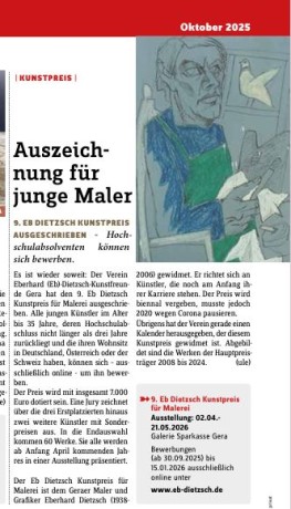 Auszeichnung für junge Maler.9. EB DIETZSCH KUNSTPREIS AUSGESCHRIEBEN - Hochschulabsolventen können sich bewerben.Es ist wieder soweit: Der Verein Eberhard (Eb)-Dietzsch-Kunstfreunde Gera hat den 9. Eb Dietzsch Kunstpreis für Malerei ausgeschrieben. Alle jungen Künstler im Alter bis 35 Jahre, deren Hochschulabschluss nicht länger als drei Jahre zurückliegt und die ihren Wohnsitz in Deutschland, Österreich oder der Schweiz haben, können sich – ausschließlich online - um ihn bewerben. Der Preis wird mit insgesamt 7.000 Euro dotiert sein. Eine Jury zeichnet über die drei Erstplatzierten hinaus zwei weitere Künstler mit Sonderpreisen aus. In die Endauswahl kommen 60 Werke. Sie alle werden ab Anfang April kommenden Jahres in einer Ausstellung präsentiert. Der Eb Dietzsch Kunstpreis für Malerei ist dem Geraer Maler und Grafiker Eberhard Dietzsch (1938- 2006) gewidmet. Er richtet sich an Künstler, die noch am Anfang ihrer Karriere stehen. Der Preis wird biennal vergeben, musste jedoch 2020 wegen Corona pausieren. Übrigens hat der Verein gerade einen Kalender herausgegeben, der diesem Kunstpreis gewidmet ist. Abgebildet sind die Werken der Hauptpreisträger 2008 bis 2024. (ule)