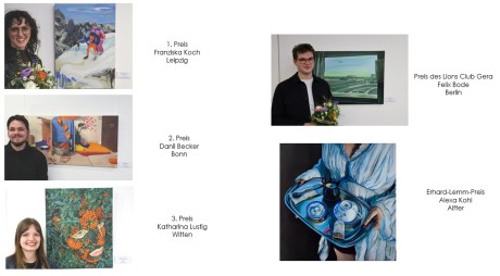 Erfolgreiche Vernissage de 9. Eb-Dietzsch-Kunstprreises für MalereiOberbürgermeister und Schirmherr Kurt Dannenberg begrüßte mehr als 100 Gäste zur Preisverleihung im Beratungscenter der Sparkasse Gera-Greizv.l.n.r: Dr. Hendrik Ziegenbein, Felix Eckerle, Franziska Koch, Danil Becker, Katharina Lustig, Dr. Matthias Hager, Jürgen Grießer (Foto: Andreas Hartmann) Eberhard Dietzsch oder einfach Eb, wurde am 3. Januar 1938 in Reichenbach im Vogtland geboren. Er war ein Künstler, der die Ostthüringer Kunstszene viele Jahre entscheidend beeinflusste. Er erlernte bis 1955 den Beruf des Lithographen, studierte von 1955 bis 1958 an die Fachschule für angewandte Kunst Leipzig. Nach einer einjährigen Tätigkeit als Gebrauchsgrafiker bei der DEWAG Gera begann er 1959 im Alter von 21 Jahren freischaffend als Maler, Grafiker und Karikaturist zu arbeiten. Nach einem unfassbar schaffensreichen Künstlerleben, allein der Nachlass zählt über 6300 Werke, starb er am 3. Januar 2006, seinem 68. Geburtstag. Der 9. Eb-Dietzsch Kunstpreis für Malerei ist aber dem 2024 verstorbenen Begründer Erhard Lemm gewidmet. Verleger und Buchautor, Freund und Weggefährte rief er 2008 den Wettbewerb um diesen Kunstpreis ins Leben, den er bis 2024 federführend organisierte. Er war auch 2020 eine treibende Kraft bei der Gründung des Eberhard (Eb)-Dietzsch-Kunstfreunde e.V. 1938 bei Danzig geboren kam er mit seiner Familie durch die Kriegswirren nach Mühlhausen. Nach dem Abitur lernte er in den 50er Jahren fürs Leben in seinen Wanderjahren durch halb Europa. Nach dem Studium an der FH für Binnenhandel in Dresden war er als Werbeleiter für die Konsum-Werbung im Bezirk Gera verantwortlich. Um der politischen Gängelei zu entgehen, fand er 1985 gegen alle Widerstände den Weg in die Selbstständigkeit mit einer kleinen Werbeagentur. Nach der Wende erfolgreicher Buchverleger fühlte sich Erhard Lemm zeitlebens seiner Heimatstadt Gera und Ostthüringen eng verbunden. In seinem Verlag erschienen u.a. Bildbände über Gera und Ostthüringen, Künstlerbiografien, Gedichtbände und Kataloge. In den letzten Jahren widmete er sich vorwiegend der Arbeit als künstlerischer Leiter unseres Vereins und der Organisation des Eb-Dietzsch-Kunstpreises für Malerei. Unser Dank gilt der Jury mit Prof. Thomas Müller, Prof. Franziska Junge, Tino Geiß, Yvette Kießling, der 1. Gewinnerin 2008, Carl Hugo Hahn 3. Preis 2022 und unserem Kulturamtsleiter Felix Eckerle. Ebenso gillt unser Dank Dr. Ziegenbein VV der SPK Gera-Greiz und seinem Team, Andreas Hartmann und Jürgen Grießer – alle drei waren von Anfang an seit 2008 dabei. Uns erreichten 124 Einsendungen von 81 Künstlerinnen und 43 Künstlern aus 49 Orten in Deutschland, Osterreich und der Schweiz und von 57 Hochschulen der Ausschreibungsländer. Weitere Studienorte der Bewerber waren Bologna, Gent, Istanbul, Toulouse, Stockholm, Glasgow, London, Fukuoka, Chico/Cal., Oslo, Nova Gorica (SLO), Brüssel, Utrecht, Seoul, Richmond/Virginia, Jerewan, Teheran, Warschau, Nizza, Kyoto, San Francisco und Belgrad. Vertreten sind weitere 16 Nationen – Luxemburg, Südkorea, Russland, Griechenland, Iran, Armenien, USA, Kuba, Kolumbien, Spanien, China, Ungarn, Rumänien, Nigeria, Ghana und Serbien. Viele der Bewerber hatten bereits Ausstellungen an namhaften Orten rund um die Welt – New York, Rom, London, Nizza u.v.m. Wir können also heute von einem internationalen Kunstpreis in Gera sprechen, darauf dürfen wir auch ein wenig stolz sein. 2026 gab 3 Hauptpreise dotiert mit 1. Preis 2500€, 2. Preis 1500€, 3. Preis 1000€ gestiftet von der Sparkasse Gera-Greiz, den Preis des Lions Club Gera, dessen Mitglied Eb war, in Höhe von 1000€ und neu, den Erhard-Lemm-Preis ebenfalls 1000€ vom Eb-Dietzsch-Kunstfreunde e.V. 1. Preis des 9. Eb-Dietzsch-Kunstpreises für Malerei geht an: Franziska Koch für das Bild 1,5°C. 2. Preis des 9. Eb-Dietzsch-Kunstpreises für Malerei geht an: Danil Becker für das Stillleben MeisterWerk#2 3. Preis des 9. Eb-Dietzsch-Kunstpreises für Malerei geht an: Katharina Lustig für ihr Bild Don´t panic Preis des Lions Club Gera geht an: Felix Bode für sein Bild Flughafen Frankfurt Der Erhard-Lemm-Preis geht an: Alexa Kohl für ihr Bild You get what You (de) serve. ![]() zurück zurück |